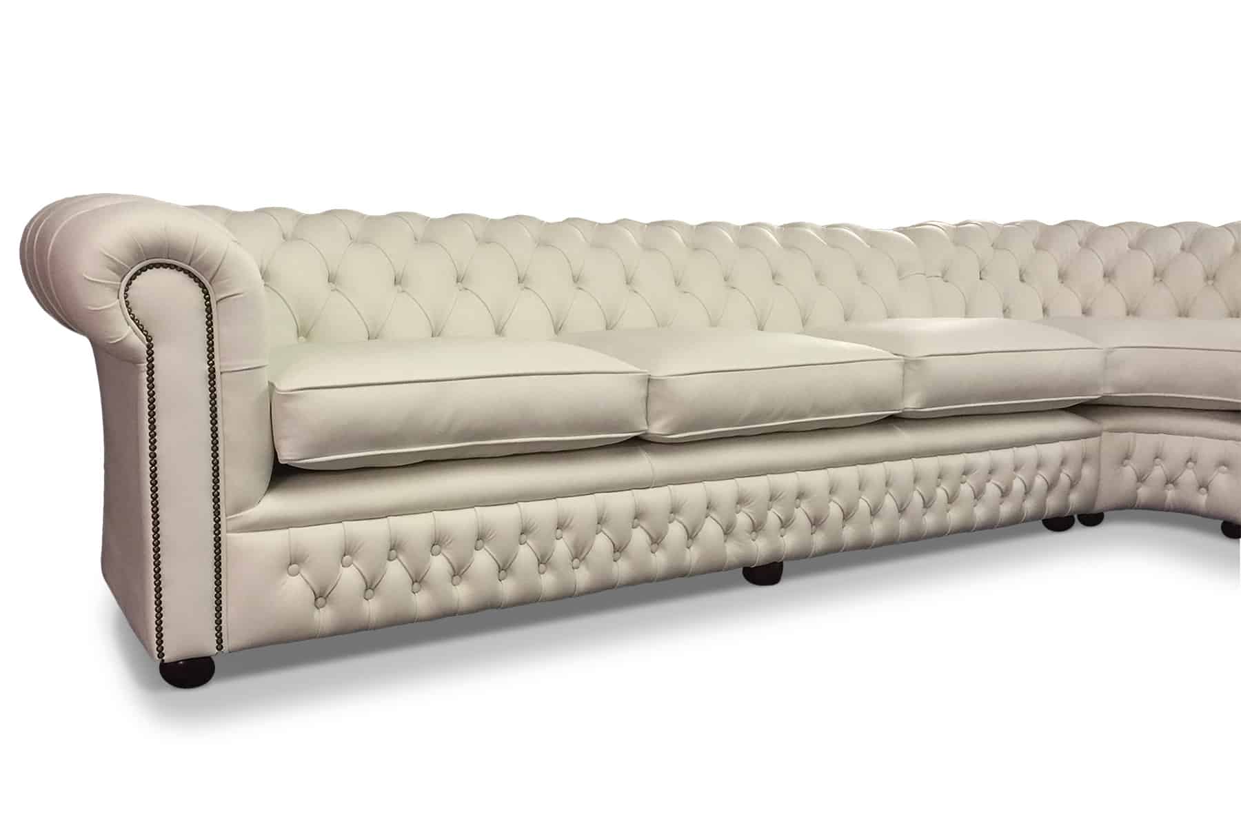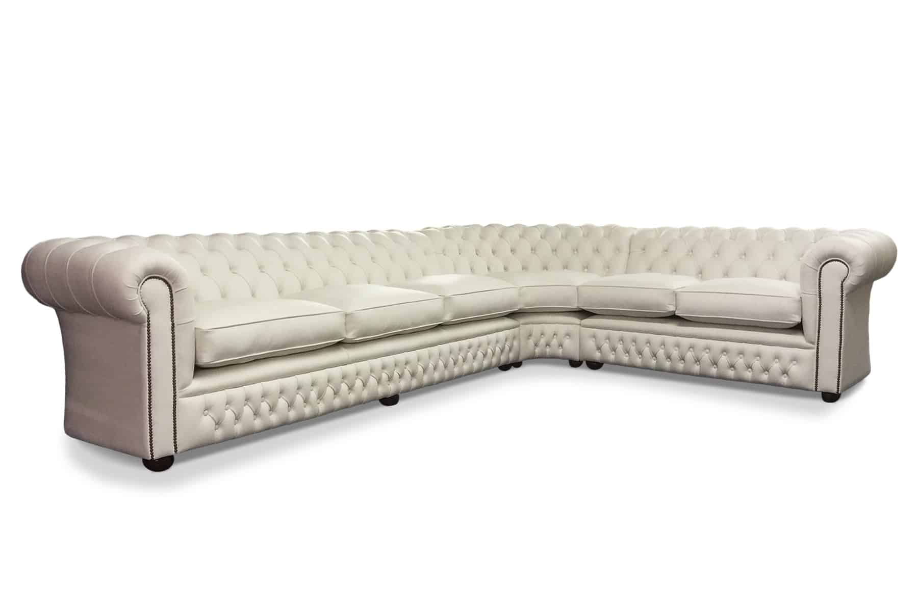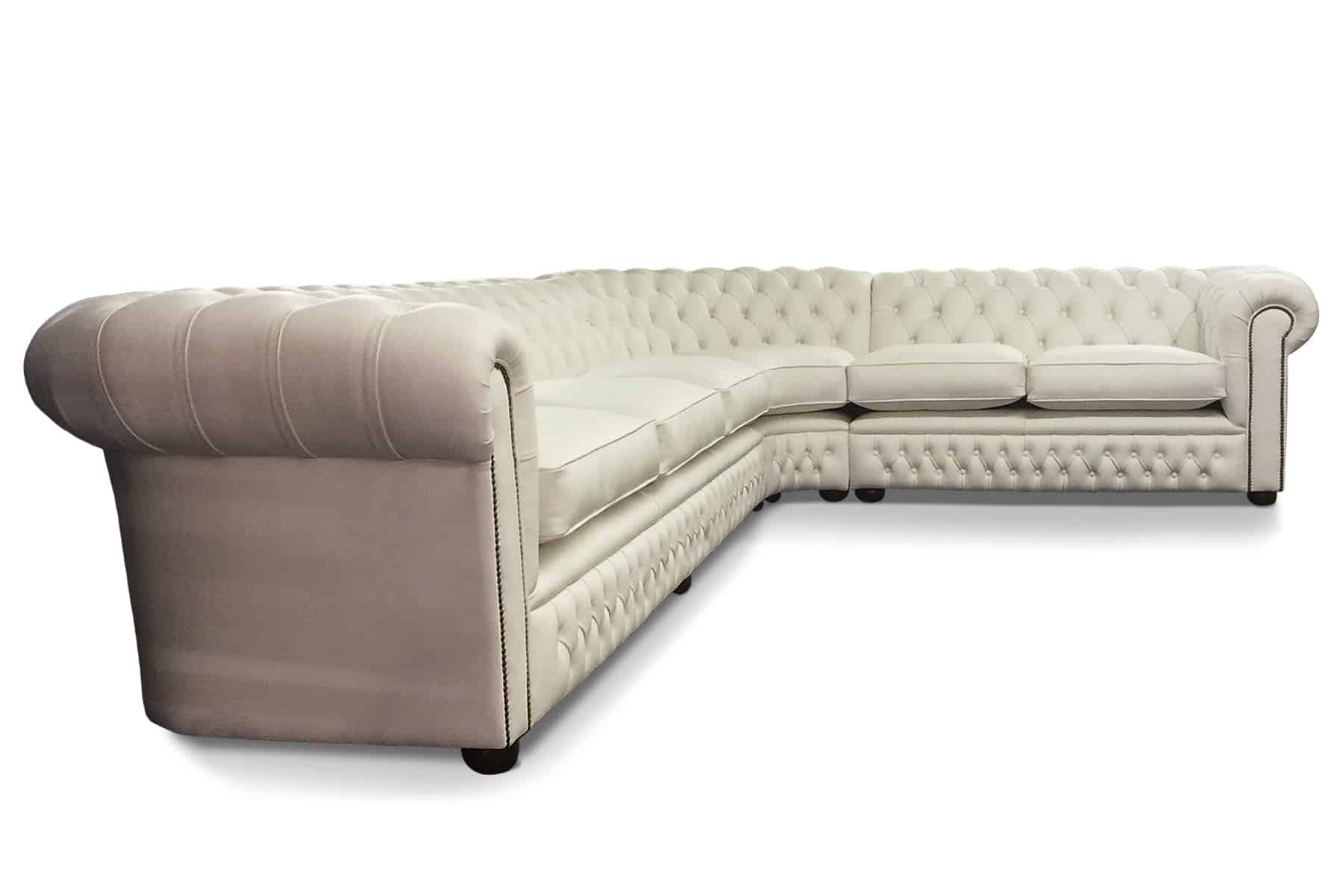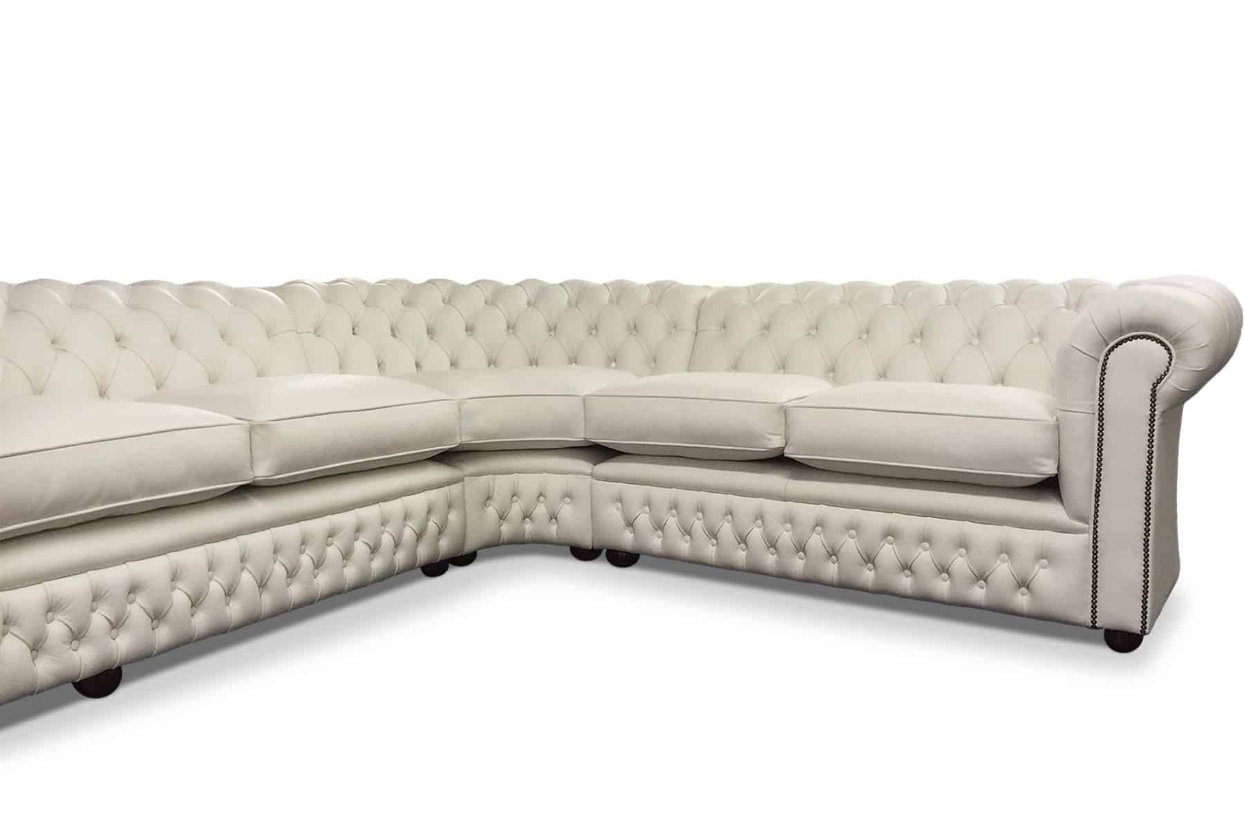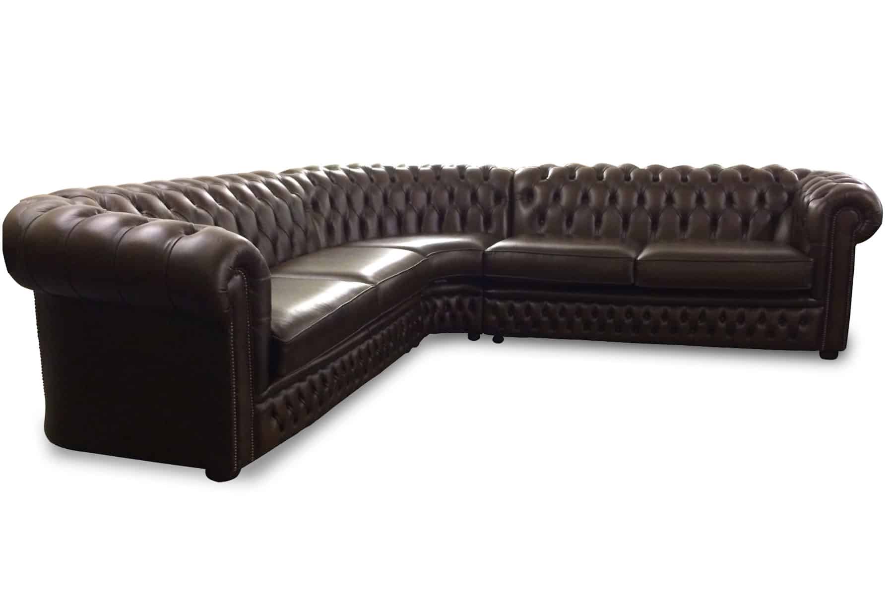 A corner leather chesterfield sofa version of the Buckingham Tudor, this can be made with any number of seats and with either a rounded corner (as shown) or a square corner (available on request).